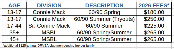 Connie Mack is offered for ages 13-44. Games are played on Saturdays, Sundays, and during the week. Practices are scheduled before and during the season.
