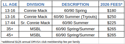 Connie Mack is offered for ages 13-44. Games are played on Saturdays, Sundays, and during the week. Practices are scheduled before and during the season.
