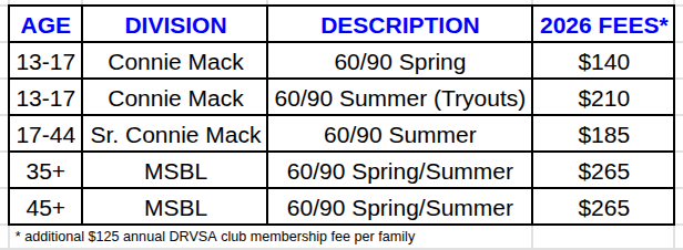 Connie Mack is offered for ages 13-44. Games are played on Saturdays, Sundays, and during the week. Practices are scheduled before and during the season.